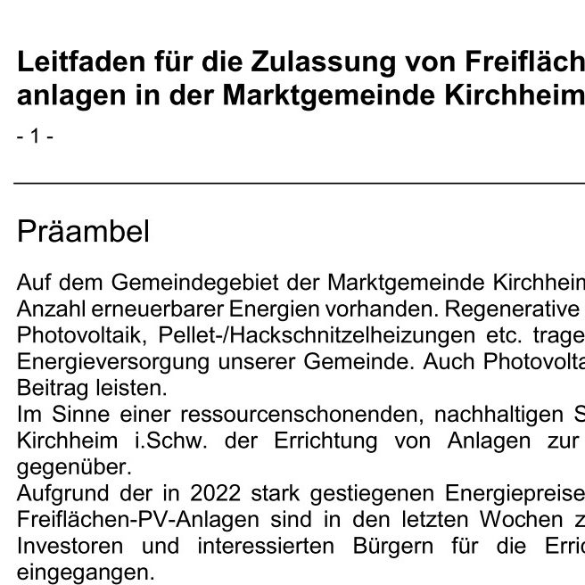 Wer sich näher über die Leitlinien zur Errichtung von PV-Freiflächenanlagen in unserer Marktgemeinde informieren möchte, kann das entsprechende Dokument auf der Homepage der Gemeinde herunterladen oder es hier einsehen.