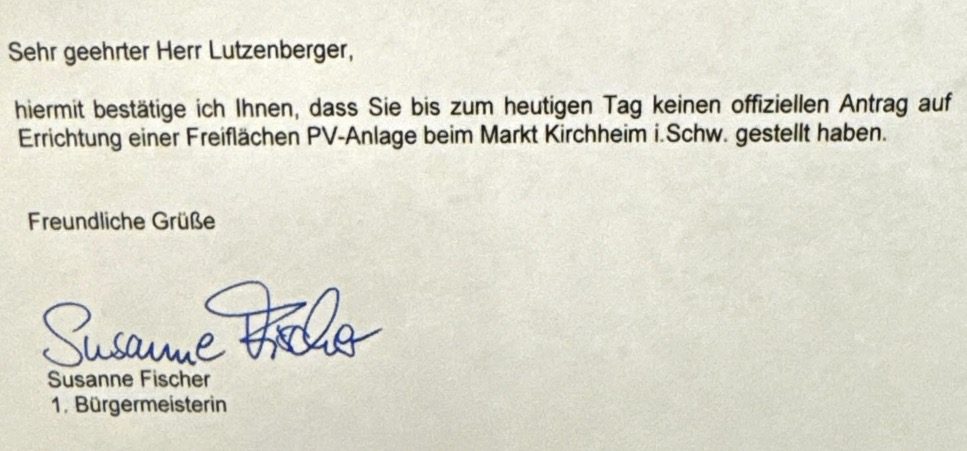 Um unseren Initiator Michael Lutzenberger zu diskreditieren, wurde das Gerücht gestreut, er hätte selbst eine PV-Anlage bei der Gemeinde angefragt und sei abgelehnt worden. Nachdem wir dieses Gerücht mit einer schriftlichen Bestätigung der Bürgermeisterin widerlegt hatten, veröffentlichte die Investoren-GbR nun eine eigene Stellungnahme.
